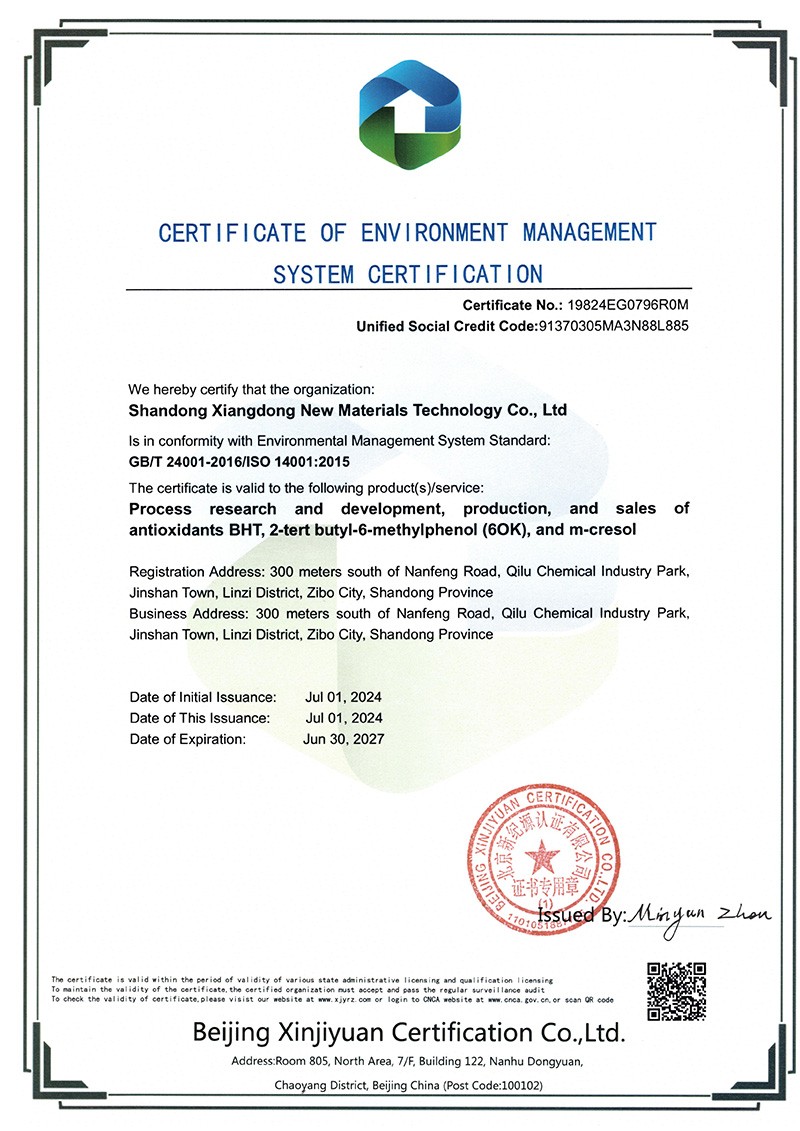 山東祥東新材料科技有限公司1.2萬噸/年6-叔丁基鄰甲(60K)、4-叔丁基鄰甲酚(偏 24 酚)和 4,6-二叔丁基鄰甲酚(偏 246 酚)烷基甲酚項目竣工環(huán)境保護驗收監(jiān)測報告